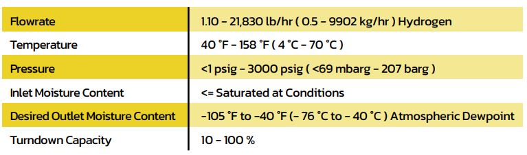 Current designs pair with electrolyzer sizes from pilot scale to 250MW. Removal of moisture and other contaminants like oxygen allows the hydrogen product to meet ISO 14687, SAE J2719, and other hydrogen quality standards. Dual tower, heat-reactivated design allows for continuous operation and purification. The closed-circuit design utilizes a captive volume at line pressure so no loss of process gas is required for reactivation of the adsorbent.