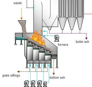 The waste is left by the garbage trucks in the waste bunker of the incineration plant. Afther the garbage is putted by the hopper from the waste bunker in the incinerator. By shifting and tumbling tiles the waste moves slowely down and burns. The combustion chamber is feeded with air from the waste bunker. This stinking air can not excape from the incineration plant and contains also oxigen (O2) for the degasification and the combustion process. The temperature is +/-950 degree Celcius and the retantion time of the waste in the furnace is +/-45 minutes till 1 hour.