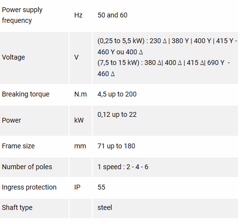 Failsafe brake operating when supply off (a braking force is applied when de-energized) on LS non IE, IE3 asynchronous three phase IMfinity motors range.