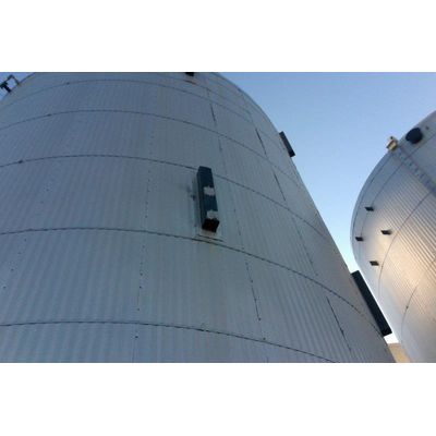 This 2500 BBL storage tanks was build by Universal Industries, it has aluminum clad insulation and is heated by fire-tubes/burners.