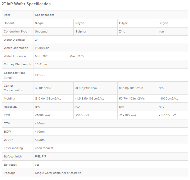 PAM-XIAMEN offers VGF InP(Indium Phosphide) wafer with prime or test grade including undoped, N type or semi-insulating. The mobility of InP wafer is different in different type, undoped one>=3000cm2/V.s, N type>1000 or 2000cm2V.s(depends on different doping concentration), P type: 60+/-10 or 80+/-10cm2/V.s(depends on different Zn doping concentration), and semi-insulting one>2000cm2/V.s, the EPD of Indium Phosphide is below 500/cm2 normally.