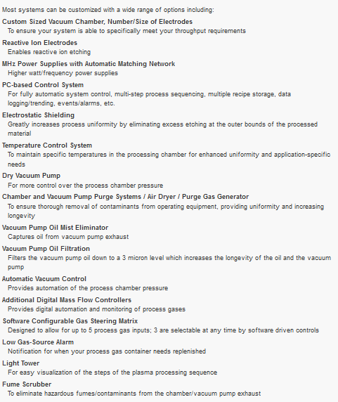 - Convertible Configuration – Includes both isotropic and anisotropic plasma processing in a single system. Removable tray configuration.