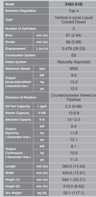 The Kubota Super Mini Series has been chosen as a power    source for a variety of applications since it was first launched 30 years ago. It has become the benchmark i    n the compact diesel engine market. The Z482 engine offers a seamless transition from E3 to E4 by totally  maintaining  the  same   performance and physical characteristics of the previous E3 engines.