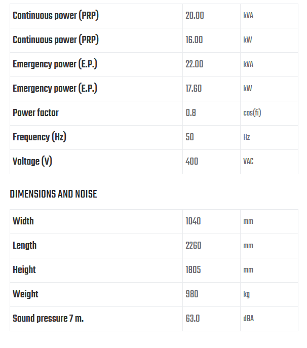 Industrial diesel engine in genset version with certificate of origin. Industrial brushless alternator with AVR. Steel baseframe with retention basin, fuel tank with level sensor. Soundproof canopy in galvanised, power coated sheet steel. Soundproofing material made of high attenuation polyester fibre. Internal exhaust silencer with insulated manifold. Electrical panel mounted on board the unit with digital control device installed in metal box. Compact for easy handling and use. Test report, manuals and electrical drawings supplied. World wide after sales service and technical support.