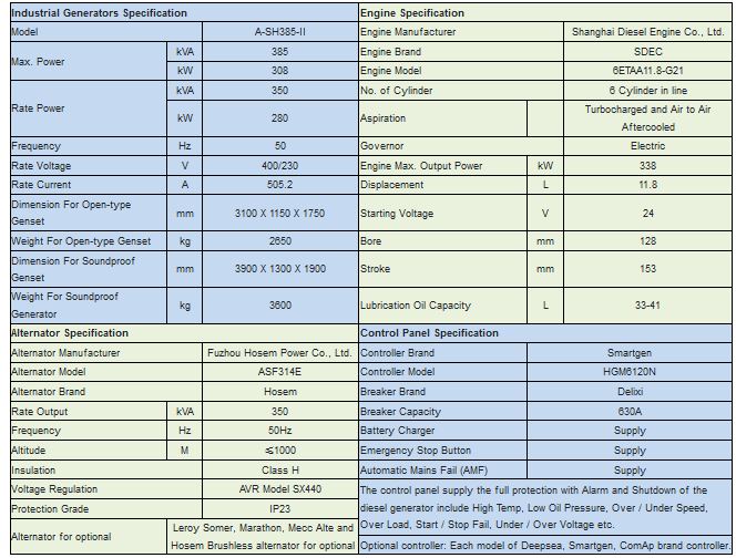 Industrial Generators with SDEC Diesel Engine, Rate Output 350kVA For Power Plant. 350kVA diesel generator powered by SDEC brand diesel engine model 6ETAA11.8-G21 made by Shanghai Diesel Engine Co., Ltd. and Hosem brand alternator made by Fuzhou Hosem Power Co., Ltd., continue output 350kVA, standby output 385kVA.