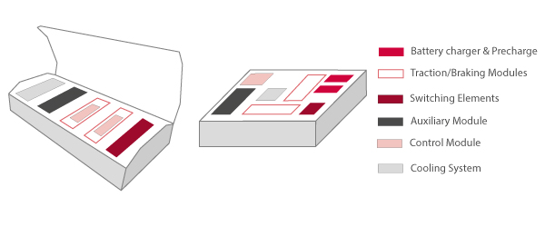 Based on proved medium power modules, the converters include all necessary elements to be fully operational: traction inverters, braking chopper, AFE, auxiliary inverters, etc… INGETRAC Medium power converters are designed to be located on-roof or under-frame, they can be air or liquid-cooled, depending on the vehicle´s manufacturers needs.