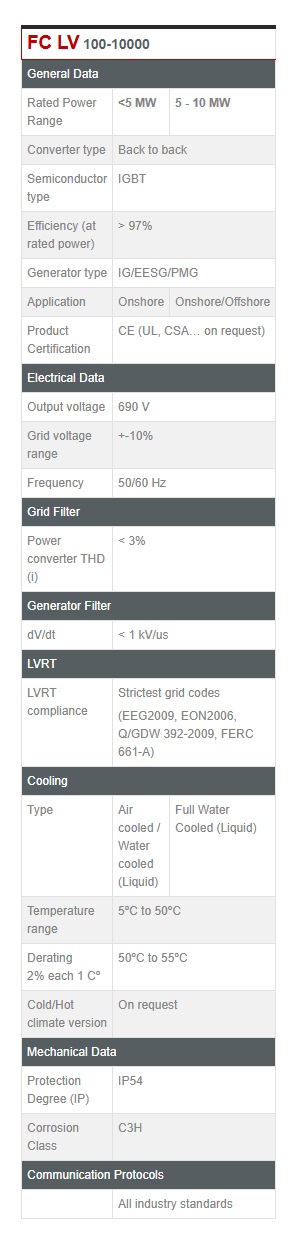 A technology used by many wind turbine manufacturers due to its operating flexibility, energy management advantages and high efficiency at low wind speeds. Low voltage FC single power converter units up to 7 MW and parallelized power converters up to 14 MW. The power converters can be adapted to the generator technology and the environmental conditions. «For wind turbines up to 14 MW suitable for on and offshore applications»