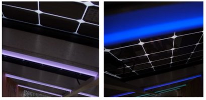 The Galaxy clip profile with colorful LED lighting. Lamps or chains of lights, mounted afterwards on terraces, canopy or carports are now things of the past. Even larger surfaces like hall roofs or facades can be upgraded easily thanks to the flexible inroof profile structure. The LED stripes are stuck in the back side of the aluminum profile and connected to the grid – then just clipping in the profile – ready.