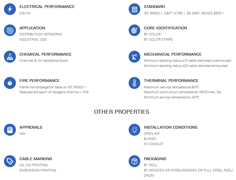 Single core and multi-core cables with copper or aluminum conductor. XLPE insulated and PVC sheathed, cables are rated at 0.6/1 (1.2)kV.