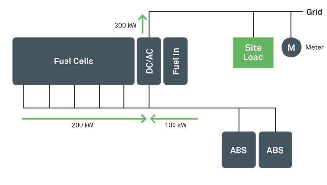 The figure below illustrates an example using a 200 kW fuel cell and 100 kW/300kWh battery. However, the Energy Server and ABS capacities can be tailored to meet a variety of customer requirements.