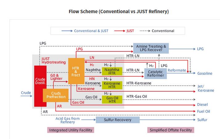 JUST Refinery (JGC Unitized Smart Tailored Refinery) is a stand-alone refinery concept which, by employing new technologies, enables a 30 % reduction of CAPEX over conventional refineries with similar functions, thereby improving the IRR by 5 %. Whereas conventional refineries need multiple hydrogen desulfurization systems for each fraction (naphtha, kerosene, gas oil), the JUST® Refinery has integrated the hydrogen desulfurization systems into a single system for the combined stream.