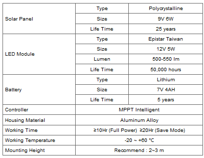 Through creative `all-in-one` design, our integrated solar light has combined high efficiency solar panel, LED module, long lifespan lithium battery and intelligent controller into one compact and easy to use system. Every component of the system has been seamlessly pre-configured one another and is housed inside a weatherproof aluminum alloy shell, making it suitable for use in open-air places.