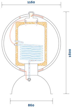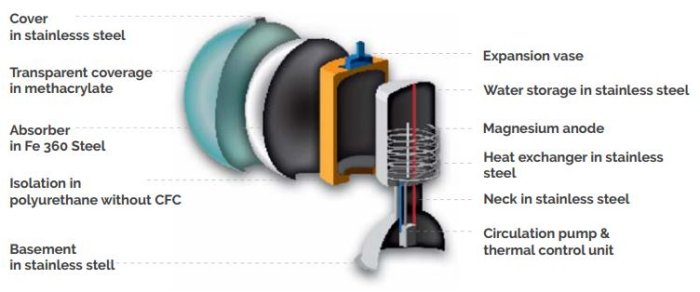 Within the Sferasol, is a 150 liter sanitary hot water tank, a thermal exchange unit, a pump and control system.