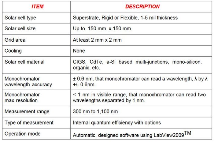 Quantum Efficiency (QE) measurements provide a primary characterization method for completed photovoltaic devices. QE system provides electronics and software designed for fully automated measurement of external quantum efficiency of solar cells. All systems include probes and a fixed plate sample stage for samples up to 150 mm x 150 mm. The main system components include: custom designed software, measurement electronics, and computer system (Windows 8 operating system).