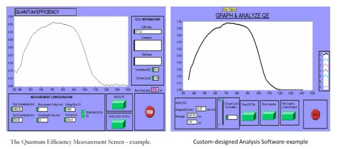 Custom designed software using LabView2009 provides a user-friendly operation for data collection, plotting and analysis. The software provides flexibility and ease of use in the measurement and manipulation of QE. Full manual control over the mono-chrometer and order sorting filters is provided for diagnostic purposes. The wavelength range and step size during measurements are user definable. Data stored to disc can be directly examined within the supplied software, or can be exported to a text file readable by most third party software packages. Up to six data sets can be plotted on a single graph for comparison. The calculated QE is convoluted with a standard AM1.5 global spectrum to determine the short circuit current.