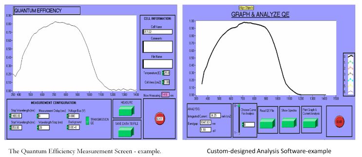 Custom designed software using LabView2009 provides a user-friendly operation for data collection, plotting and analysis. The software provides flexibility and ease of use in the measurement and manipulation of QE. Full manual control over the mono-chrometer and order sorting filters is provided for diagnostic purposes. The wavelength range and step size during measurements are user definable. Data stored to disc can be directly examined within the supplied software, or can be exported to a text file readable by most third party software packages. Up to six data sets can be plotted on a single graph for comparison. The calculated QE is convoluted with a standard AM1.5 global spectrum to determine the short circuit current.