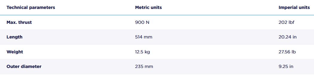 - Excellent thrust-to-weight ratio, low power consumption in the given power category