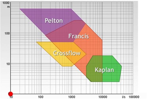 Head (meter): 3 - 25. Flow (l/s): 30 - 250. Output (kW): 1 - 20. Built from a kit. To be assembled in a basic mechanical workshop. Options: A completely galvanized turbine ready for installation; or the supply of an assembled and equilibrated rotor, with the rest of the machine in detached parts; or the supply of the whole turbine in detached parts.