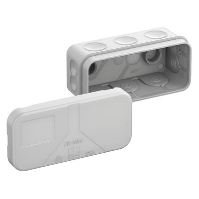 Productnumber: 34490801 | Dimensions: 89 x 43 x 38 mm. Junction box, protection class IP55, nominal cross-section 2.5 mm², Ui=400 V AC, certified by VDE (DIN EN 60670-1/-22 (VDE 0606-1/-22)), self-sealing, soft insertion membranes, sealing range 2 - 14 mm, (1 rear, 10 side), internal fixing points, for standard indoor installations grey, without terminals.