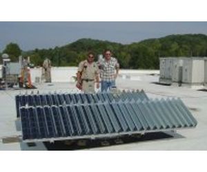 The 100kW array is a rooftop mounted horizontal beam tracking system with 672 3Sun Mirror Modules. The tracker was designed and built by Array Technology in Albuquerque, NM to fit onto building integrated support posts. The array is wired to a single grid-tied SMA inverter.