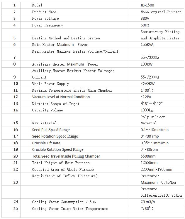 JD-1600 Mono-Crystal Furnace is a flexible shaft lifting-pulling type mono-crystal furnace. It is a device used in the inert gas atmosphere using the graphite resistance heater to melt certain silicon materials for growing dislocation- free mono crystals by the Czochralski method. It can produce high-quality silicon mono-crystal required by large-scaled integrated circuits. This equipment can use 30-40inch hot-zone system with maximum charging of 1000KG to grow mono-crystals of 12inch or less. It’s adaptable for “ 210 wafer” and the capacity is much improved.The equipment has the technical characteristics of the original JD series mono crystal furnace and belongs to the advanced automatic furnace type. With perfect automatic fusion function, it can realize automatic control from heating to finishing. The appearance design, maintenance convenience, degree of automation and various performance indicators in the industry are in a leading position.
