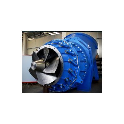 This turbine represents the company strength. It has been developed through the years in order to supply a product suitable for installations on irrigation channels with medium capacities and heads from two meters. The heart of the machine is represented by an adjustable blades runner, able to keep the maximum efficiency thanks to the level regulator command. In by-regulated version the coordination between the movement of the runner blades and the distributor allows the turbine to expand its field of operation to those situations of strong variations in flow and hydraulic head.
