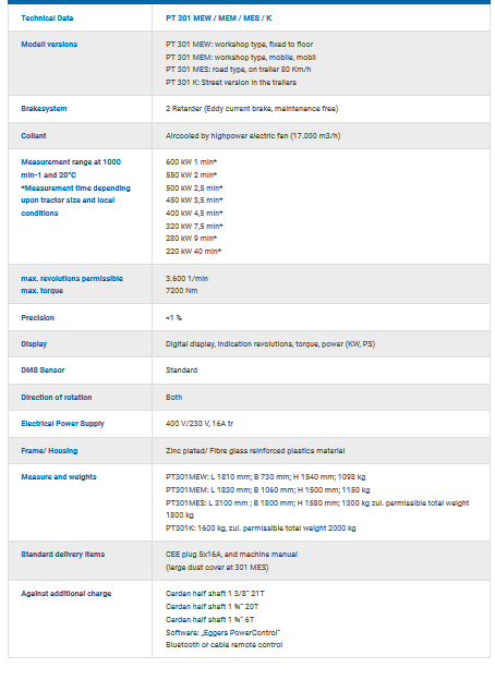 Numerous available versions of the EGGERS dynamometer PT 301 allow customers to select the model optimally suited for their business. The PT 301 dynamometer is our top-seller, while the PT 301 MEW is permanently installed in a fixed location as a stationary model, e.g. in a test room. While the PT 301 MEM model is intended for use in mobile workshops, the PT 301 MES & K can be approved for use on public roads, allowing journeys to customers or the nearest branch. With 600 kW for the rapid test and 340 kW for the full-load curve, the PT 301 covers all types of tractors released on the market to date as well as much of the harvesters.