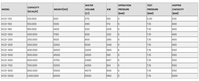 Our boilers are produced as totally cylindrical and 11 in models between 300,000 Kcal/h and 800,000 Kcal/h. Thanks to its wide bunker, rescues from coal loading as it deposits the fuel for two days. The cover part of our boilers hass been designed with a crane system which does not break joints and with a special flame baton for the inner part of the cover.Thanks to this feature of the product, the deformation of the cover is avoided. Ash removal and mixing systems are optionals. Thanks to its wide bunker, rescues from coal loading as it deposits the fuel for two days. The cover part of our boilers hass been designed with a crane system which does not break joints and with a special flame baton for the inner part of the cover.Thanks to this feature of the product, the deformation of the cover is avoided. Ash removal and mixing systems are optionals.