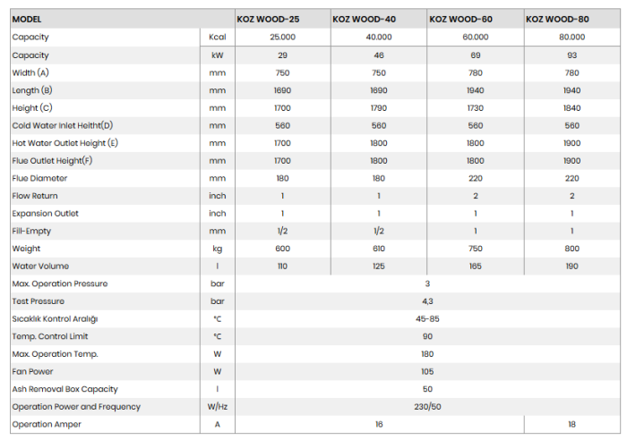 With the available capacities between 20.000 Kcal/h - 100.000 Kcal/h, the KOZ series have been designed to burn coal, olive husk, olive husk pellet, olive stones, nut shelter very efficiently. It provides and extra comfort thanks to its automatic ignition, automatic ash removal (Optional), automatic mixing systems.