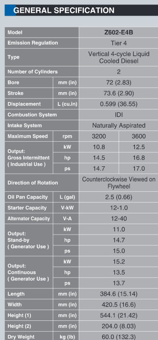 Kubota Engine - Model Z602-E4B -Industrial Diesel Engine