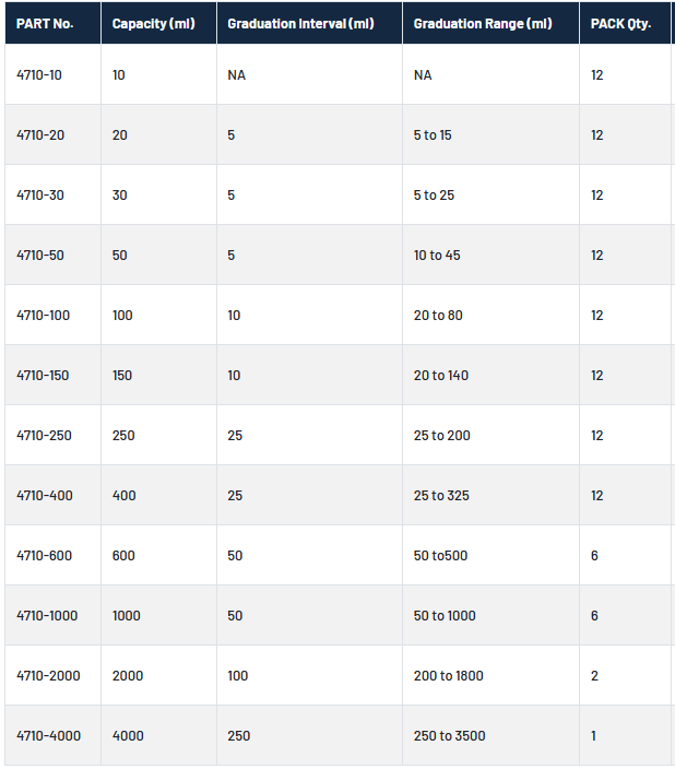 Complies with ASTM E-960, TYPE 1. Printed in white colour enamel. Large labeling field for easy marking. Uniform wall thickness. Ideal for heating liquids. Printed in double scale. Highly resistant to chemical attack.