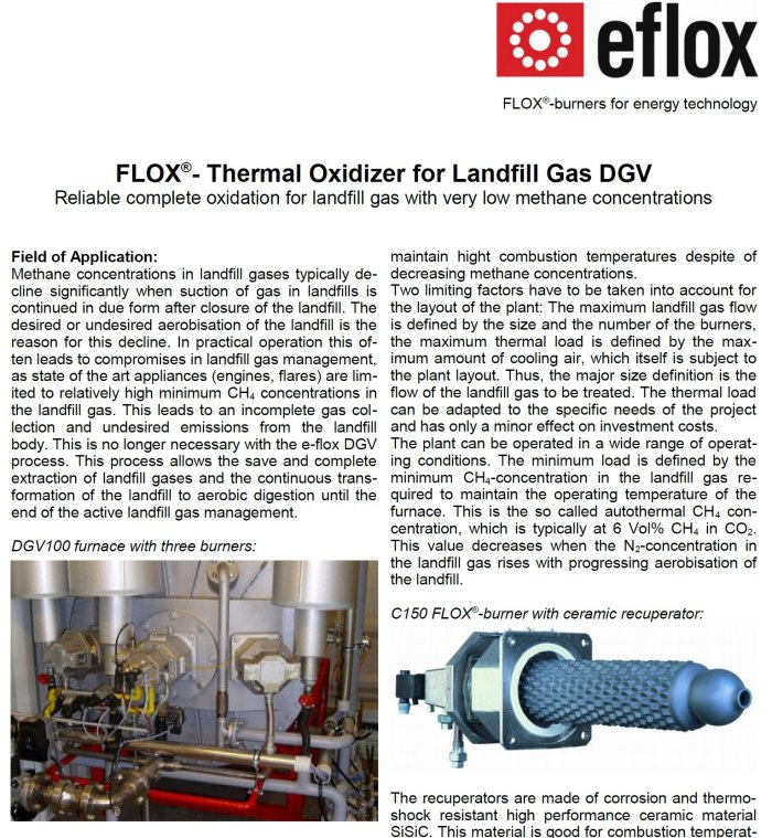 e-flox provides combution systems which allow to treat even very low grade landfill gas with a high efficiency on both, oxidation of hydarocarbons and recovery of waste heat. This makes it a perfect tool to treat the landfill gas of old landfills. Landfill gas combustion plant from e-flox are well established in Europe.