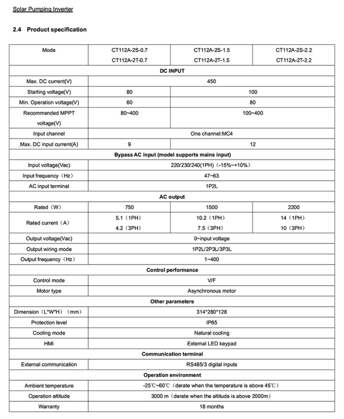 A complete solar pumping system consist of solar array, pump and solar pumping inverter. The inverter can convert DC power from solar PV array to AC power to run pump motors. Solar array.an aggregation of many solar modules connected in series and parallel.absorbs sunlight radiation and converts it into electrical energy.providing dynamical water for the whole system. Inverter controls the system operation and adjust the output frequency in real-time according to the variation of sunlight intensity to realize the maximum power point tracking (MPPT).