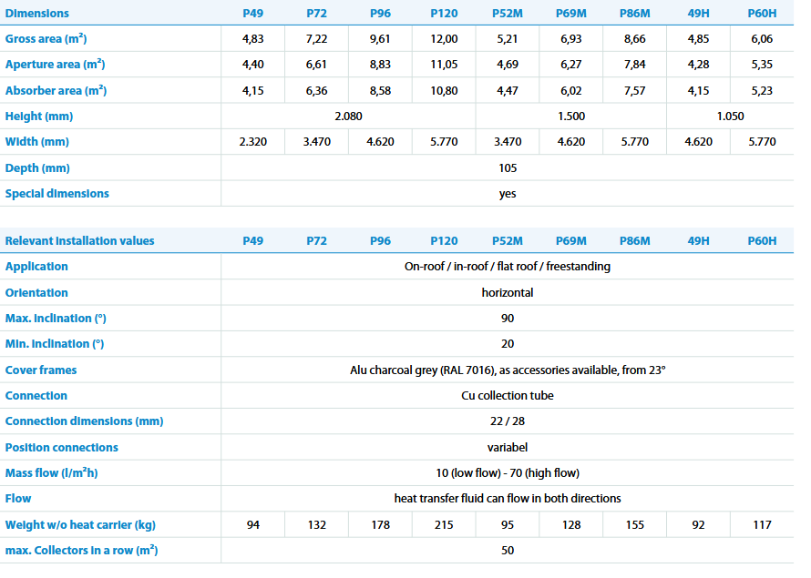 For in-roof and on-roof installation. Double-wall powder-coated frame. Many different types. All-copper strip absorber. Construction height 1.05 / 1.5 / 2.08 / 4.22 m. Gross surface area: 4.83 m² to 12 m².
