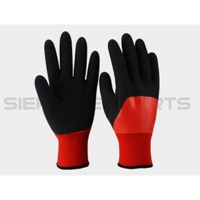 13G Plated, Red 100% Polyester (Outside), Grey Acrylic Terry (Inside), Red Foam Latex Fully Dipped, Black Sandy Latex Open Back, Glove.