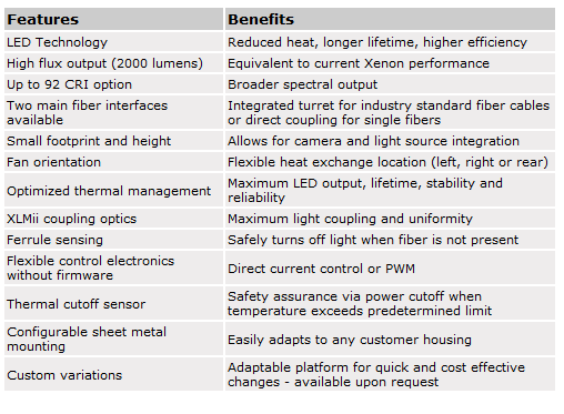 The XLMii Fiber Optic Light Source is a compact, white light, LED light source for OEM medical applications such as endoscopy, surgical microscopy and headlamp systems. The XLMii features pre-designed, configurable components that can be quickly and easily adapted to specific customer requirements minimizing design investment. As a result, product design for the most critical medical lighting requirements can be significantly reduced, allowing for shorter time-to-market.
