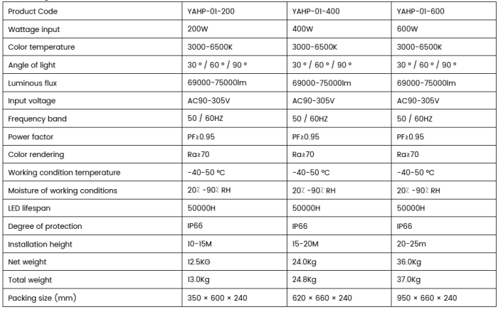 Material: die-casting body. Gearbox available. Tempered glass cover and PC lens. This series is a three-volume high-performance mast. The light fixture is made of high-pressure cast aluminum.It must have a driving efficiency of up to 120 lm / w and will be able to produce up to 75,000 lumens of 4000K luminance modules finished in gray or black according to their standards.