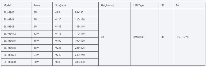 LED Power Consumption: 3W-30W. Operating Voltage: AC85-285V 50/60HZ. LED Chip: San an/Epistar/Bridgelux/ Philips/Osram. LED Driver: SUNLE PF95% / LiFud/Sosen. Power Factor: >0.90. LED Luminous Efficiency: 60-110LM/W. Lamp Efficiency: >0.8. IP Rating: IP44. Warranty: 3-5 years. Finishes: White/Customized.