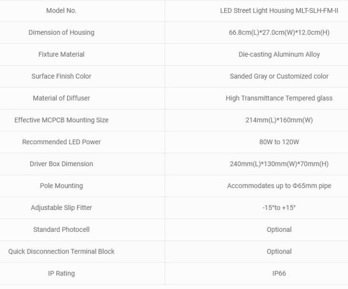 This LED street light housing fixture MLT-SLH-FM-II is the medium size of SMD LED street light housing fixture from Moonlight LED street light F series. Modern design, precision die-casting molded and superior corrosion resistant coating finish housing with standard twist lock photocell mounting platform, make this housing can be used for variety of LED roadway lighting applications.