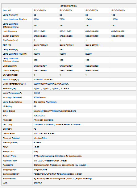 Sunshinelux - Model 50W, 60w, 80W, 100W, 120w, 150W, 200W -LED Street Lights