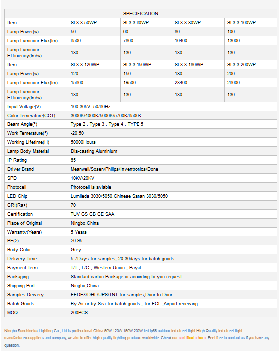 Sunshinelux - Model 50W, 120W, 150W, 200W -LED Street Lights
