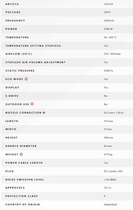 The temperature is infinitely adjustable between 50 - 650 °C / 122 - 1202 °F, and offers constant performance for plastic welding, heating, shrinking or drying. The air volume of the heat gun can be adjusted between 160 and 300 (550) l/min or 0.09 - 0.18 (0.32) ft³/s respectivley. Its unique and quiet at only 65 dB (A), with configurations tailored to customer needs, i.e. temperature and air flow range, making it the perfect tool for various hot air applications.