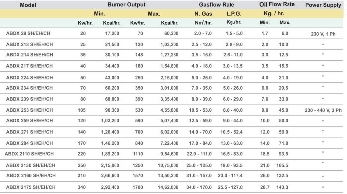 Two Stage Operation (High /Low). Dual fuel burner for Natural gas, L.P .G., H.S.D., L.D.O., and Diesel. Available for Pyrolysis Oil & Kerosene. Available for Biogas, Town gas & Producer gas. Hi- Low version with electric servomotor and integrated systems for the regulation of air , gas and light Oil with nozzle. Single nozzle Hi-Low version available up to ABDX 239. Two nozzle Hi-Low version available From ABDX 253 to ABDX 2175. Dual Fuel burner suitable to burn gas as well as light oil. Manual Oil Flow Adjustment. Independent gas flow adjustment for each single valve. Compatible with any type of combustion chamber.
