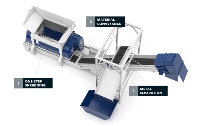 In one-step shredding, the focus is on the shredder as a single-step solution. Untreated waste from households, commerce and industries is mostly fed into the primary shredder directly via wheel loaders, diggers or dosing hoppers with the aim of obtaining homogeneous, sortable material in a single step.