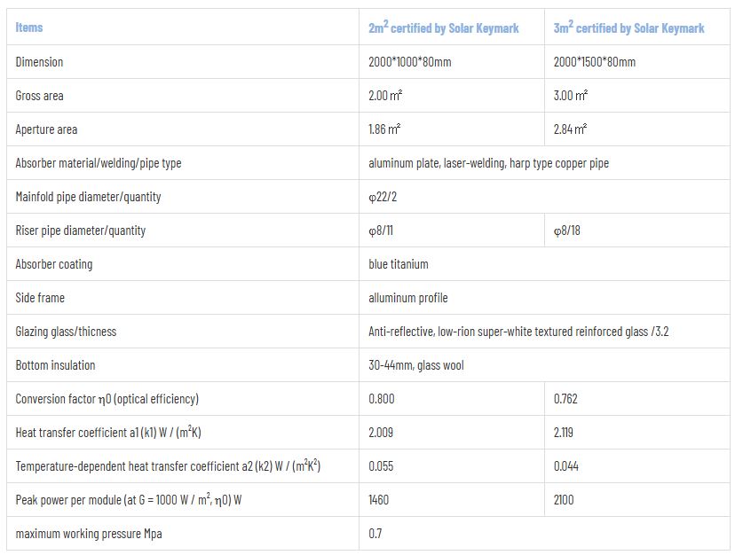 Suitable for water, space and process heating with 60?-80? temperature requirements. Higher efficiency for temperature range under 60 ??Without overheating problem in summer season. 80mm thickness ensures its better energy yield in winter time. The high quality selective coating material and multiple insulation technologies ensures the high absorption rate, low emission rate and excellent heat preservation performance. Certified by European Solar Keymark, with European standards annual energy yield.