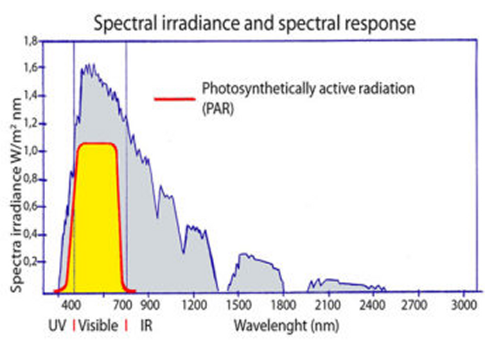 Thanks to a dedicated filter, a PAR meter measures the spectral portion of the light in the 400-700nm range along a planar surface which corresponds to the PAR (Photosynthetically Active Radiation). This is the precise wavelength on which plants photosynthesize.