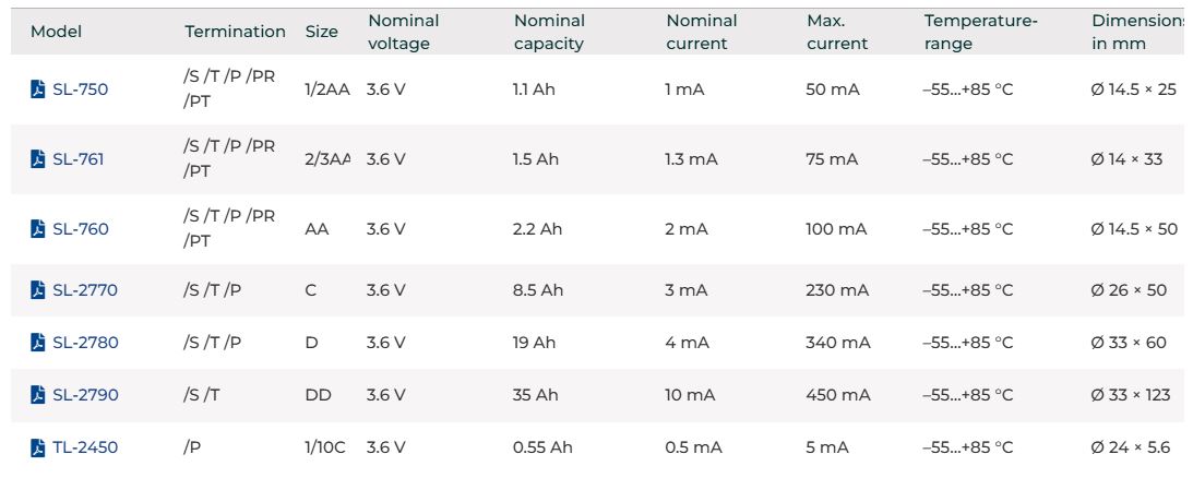 Batteries of SL-700 / SL-2700 series – iXtra – Moderate Continuous Current. Provides 3.6 V and 730 Wh/Kg, enabling product miniaturization and extended operational life. Suitable for discharges with continuous current demands ranging from tenths to several milliamperes (mA). Ensures long-term reliability, even in applications with moderate consumption.