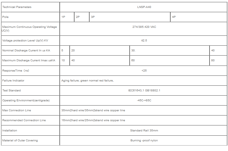LNSP-A40 series surge protective device (hereinafter referred to as the SPD) is suitable for low voltage AC power distribution system such as IT,TT,TN-C and TN-C S etc., it protect against the influence from the indirect lightning and direct lightning or other transient over voltage surge.