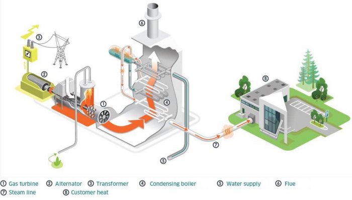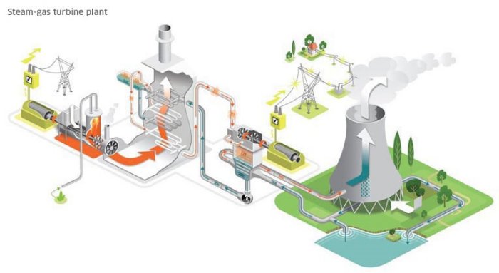 Combined cycle gas power plants (or steam-gas turbine plants): these combine a gas turbine and a traditional thermal plant to generate electricity. Unlike conventional thermal power plants, the residual energy of the gases is used for another cycle. This is one of the reasons for which these kind of plants are more efficient (by 56%), also meaning that they produce lower CO2 emissions than conventional plants.