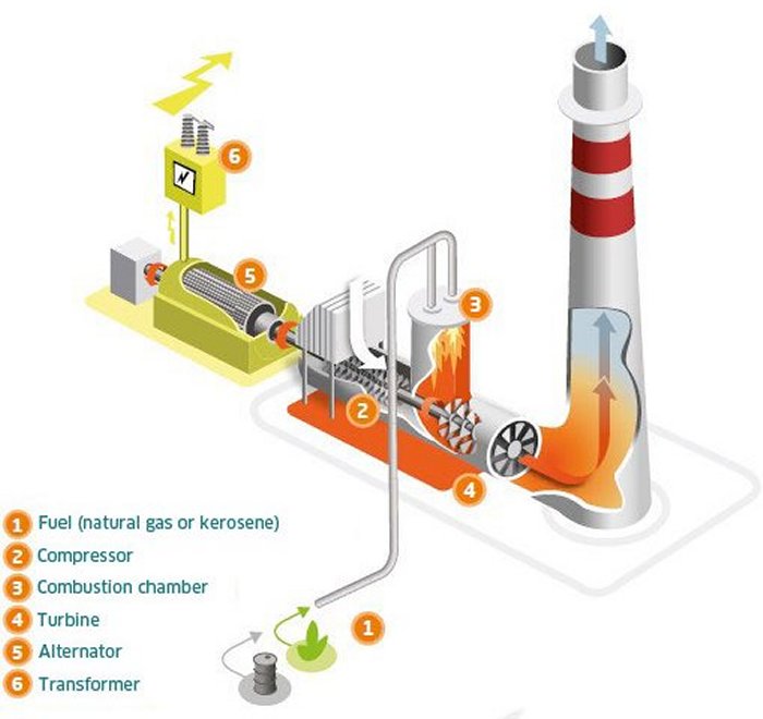Gas turbine and turbojets: the compressor draws in air, compresses it and injects it into the combustion chamber. Natural gas (gas turbine) or kerosene (turbojet) is injected into the chamber to be burned. The hot combustion gases rotate the turbine, which drives an alternator to produce electricity.